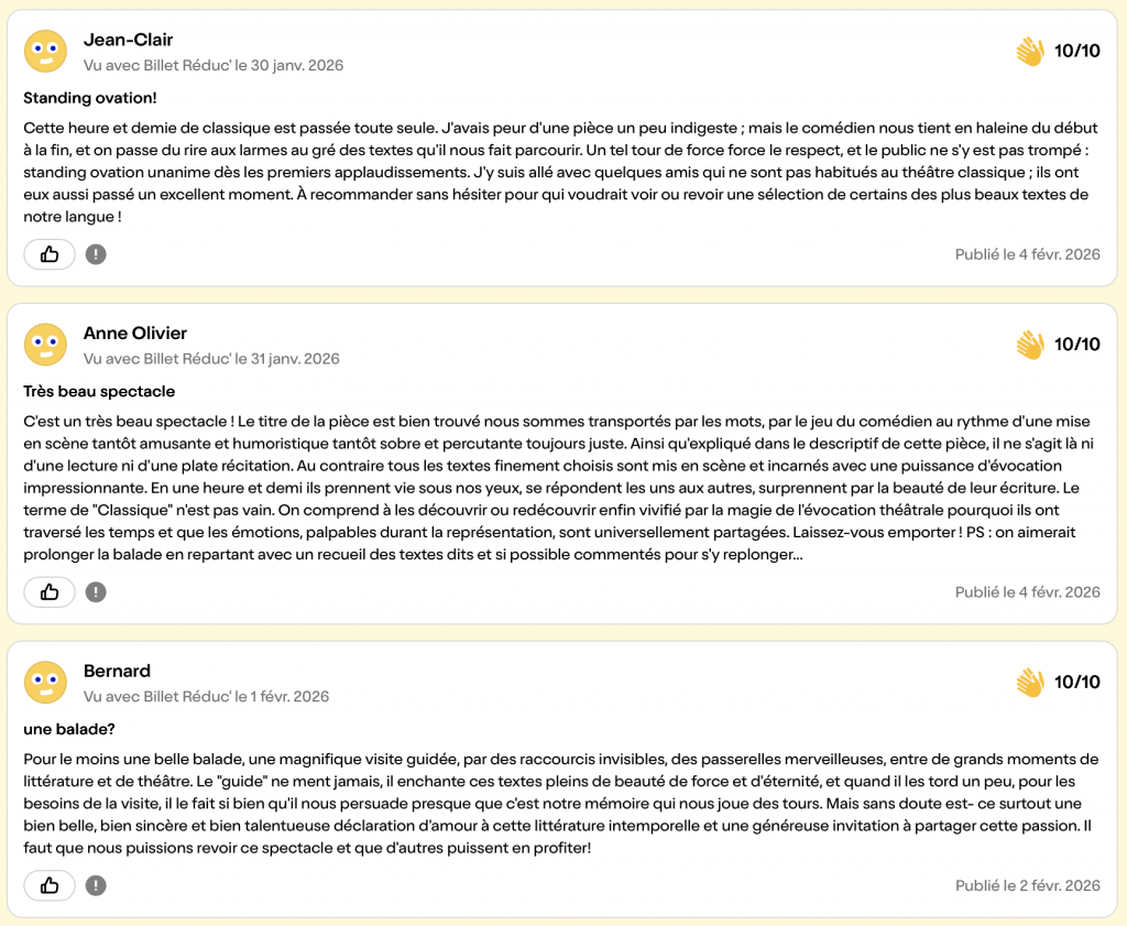 Nous passerons du rire de Molière à l’emphase de Hugo, de la solennité de Corneille à l’âpreté de Villon, nous chanterons l’amour à travers les accents d’Homère, de Racine, ou de Baudelaire… Nous ré-entendrons ensemble la musique de ces mots qui nous ont façonnés, et qui n’ont rien perdu de leur actualité.
