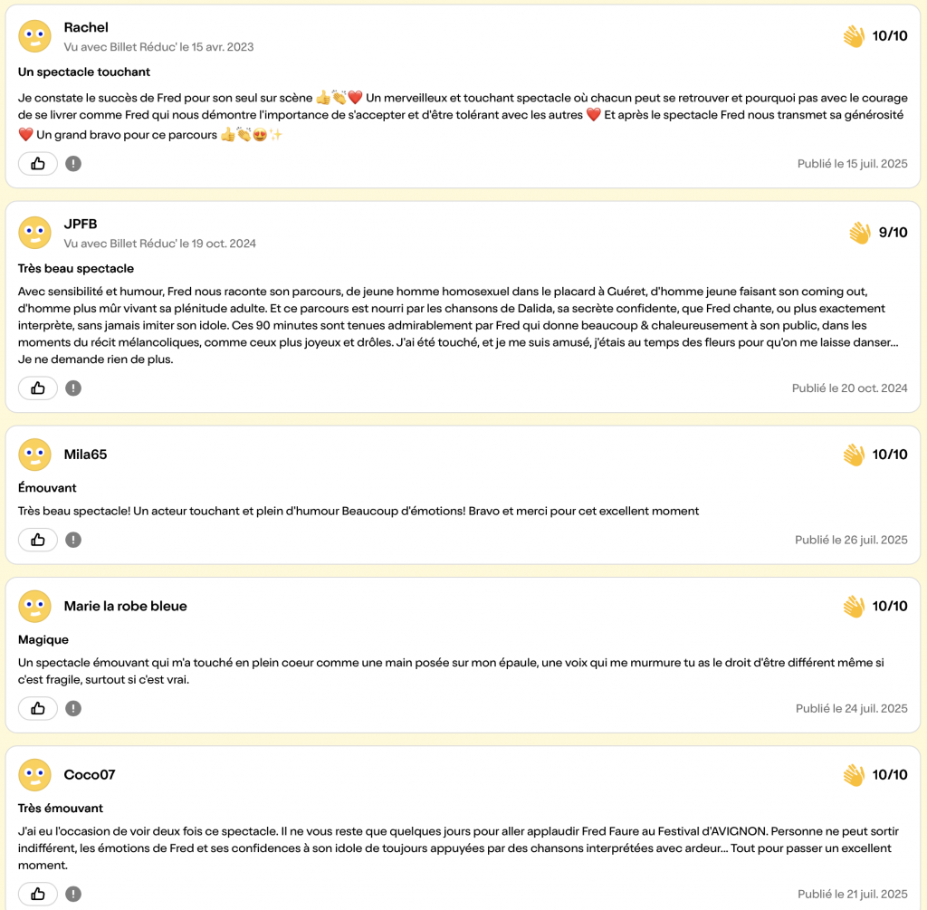 Il nous livre l’expérience touchante de son chemin de vie, un message personnel et un hymne à l’amour qui invite à la tolérance et à l’acceptation des di!érences. Sous le regard et la complicité de sa bonne fée Dalida, Fred nous dévoile le secret de ses rencontres :